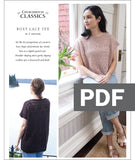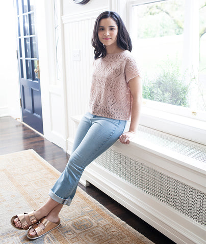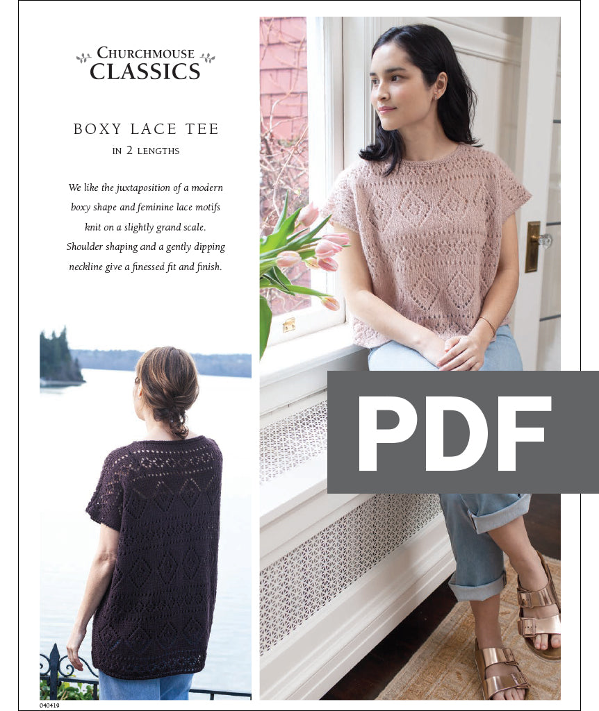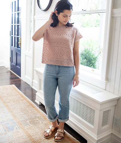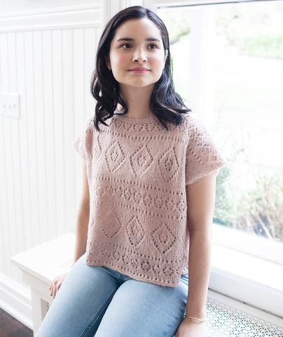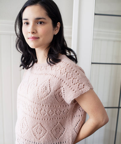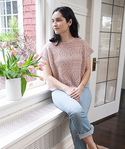 We like the juxtaposition of a modern, boxy shape and feminine lace motifs knit on a slightly grand scale. With shaped shoulders, a gently dipping neckline, and options for two different lengths, this lacy top is so easy to pop on, and feels both comfy and really pretty.