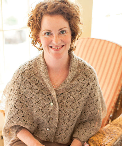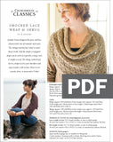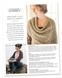 Jennifer Evans designed this piece with her characteristic mix of romantic and rustic. The vintage smocked lace stitch is easier than it looks. And the simple rectangular shape can be worn as a poncho, a large cowl, or simply a scarf. The shrug, seamed into sleeves, drapes across your shoulders and stays in place with no fuss. Wear it over a pretty dress, or jeans and a T-shirt.