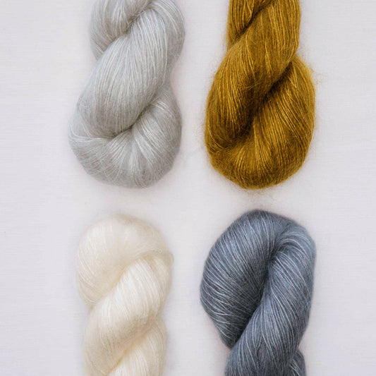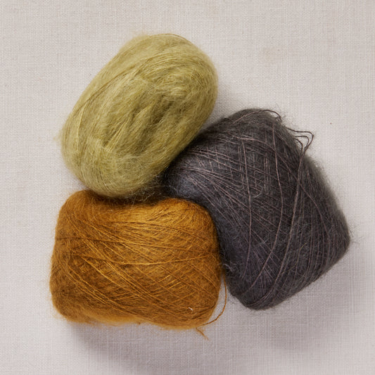 The pairing of silk and mohair is one of our very favorite fiber blends. Smooth, shimmering silk and wispy kid mohair—together, they're soft and strong, warm and airy... And the fuzz is just so pretty!