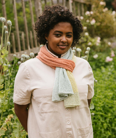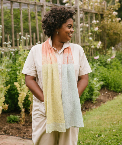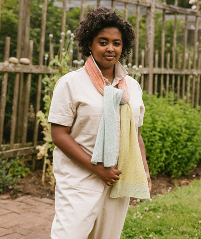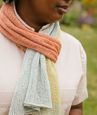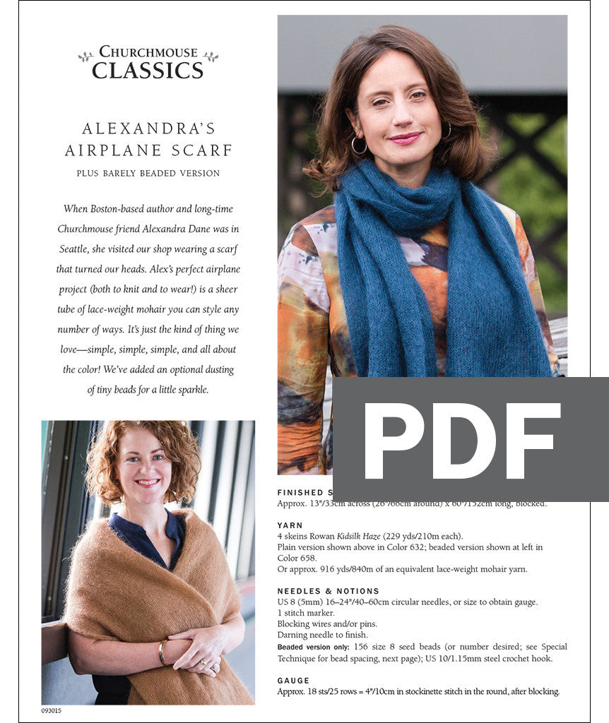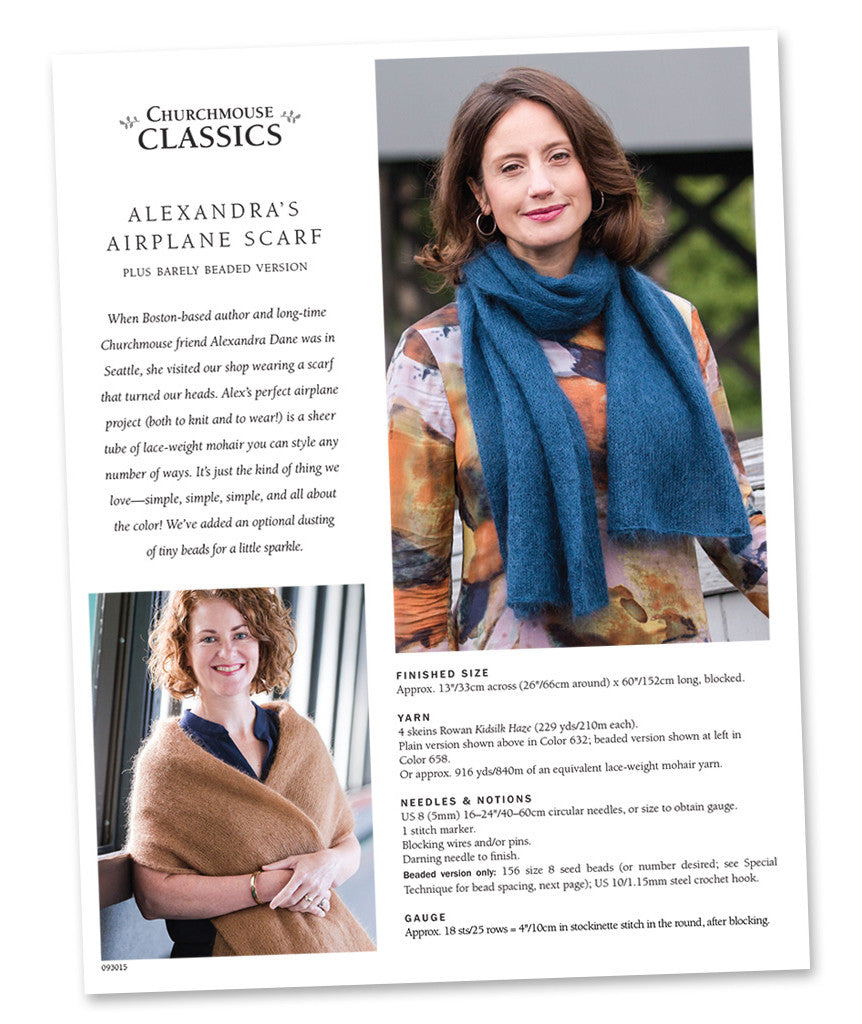We like to think of this scarf as the perfect airplane project—both to knit and wear en route. You can style this sheer tube any number of ways; it’s just the kind of thing we love—simple, simple, simple, and all about the color!