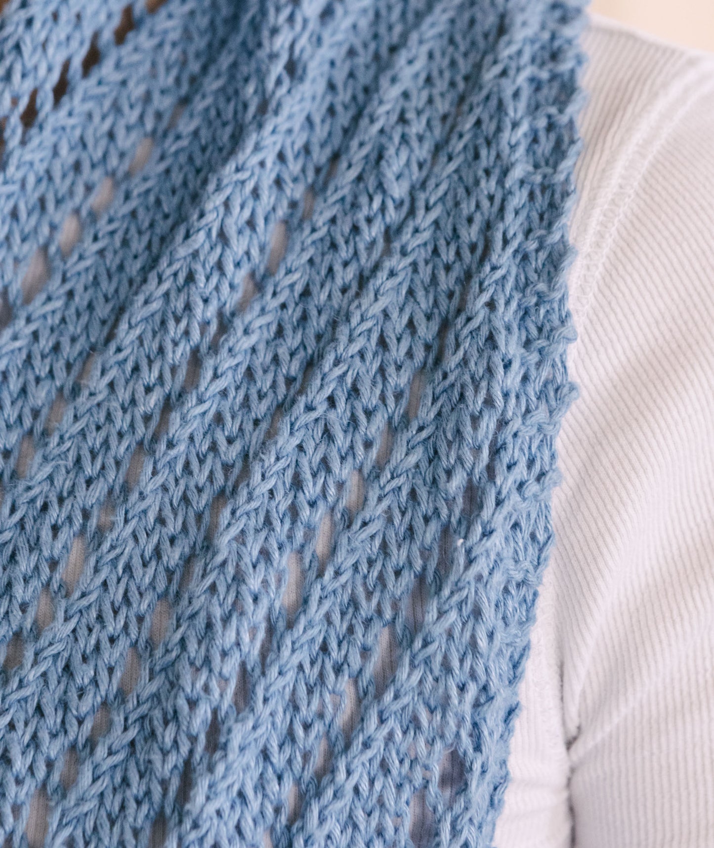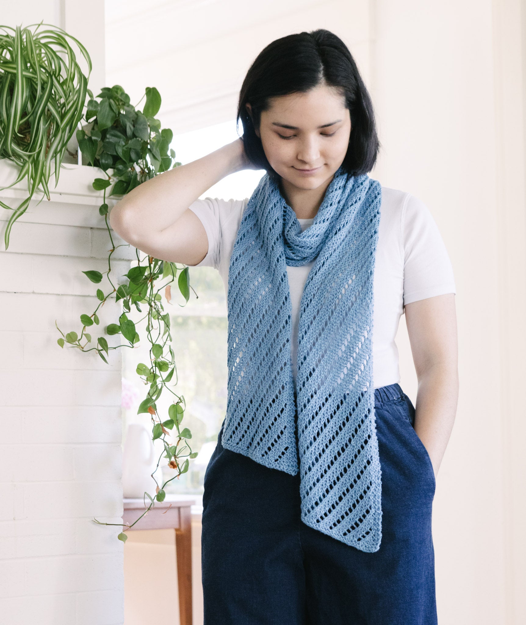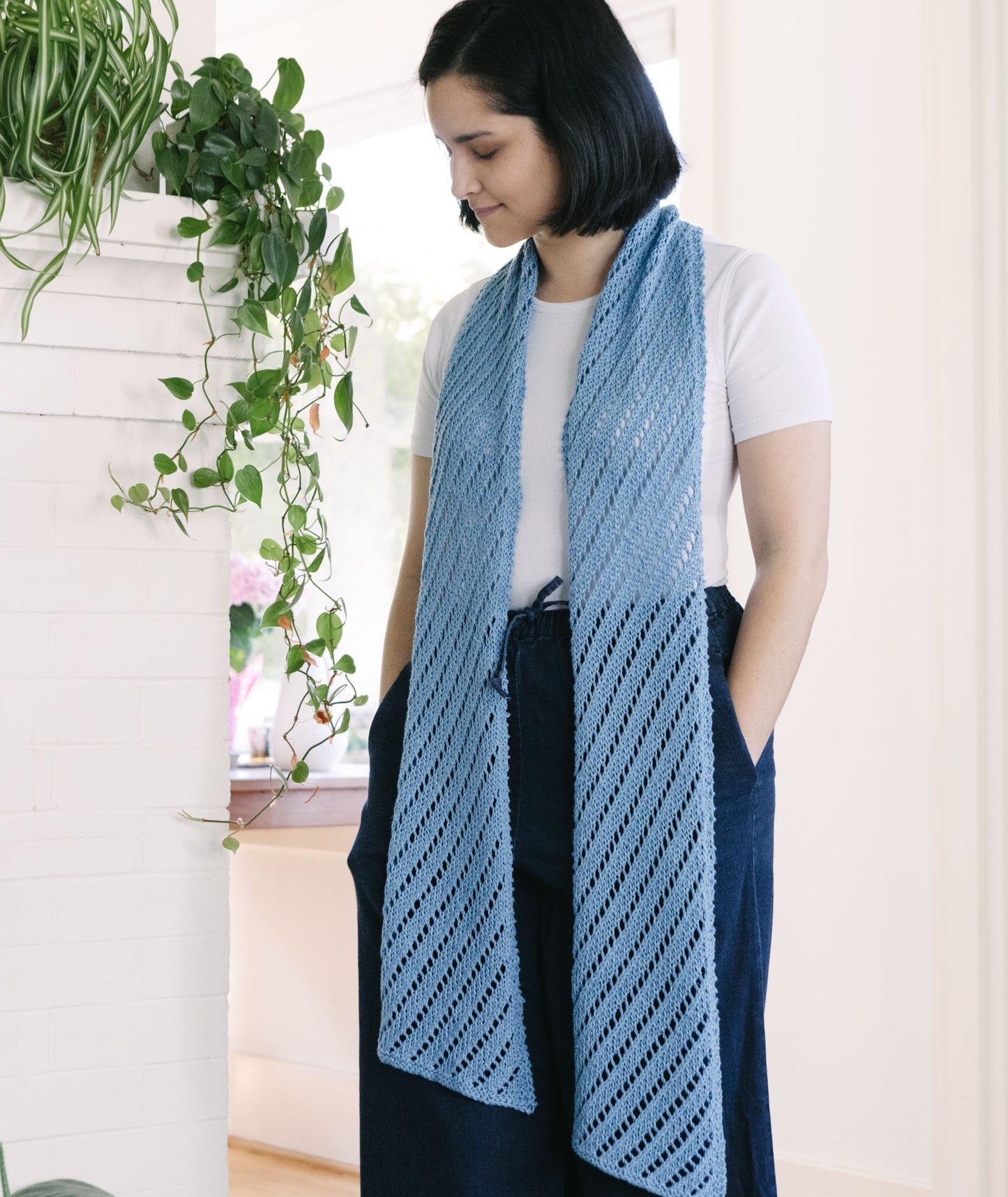 The Diagonal Lace Scarf is perfect for lightweight coziness indoors or out. And it’s an easy and satisfying lace pattern to knit–the repeating diagonal lines of eyelet provide easy visual clues, so you can quickly learn to “read” your lace and stop counting and looking at the chart.