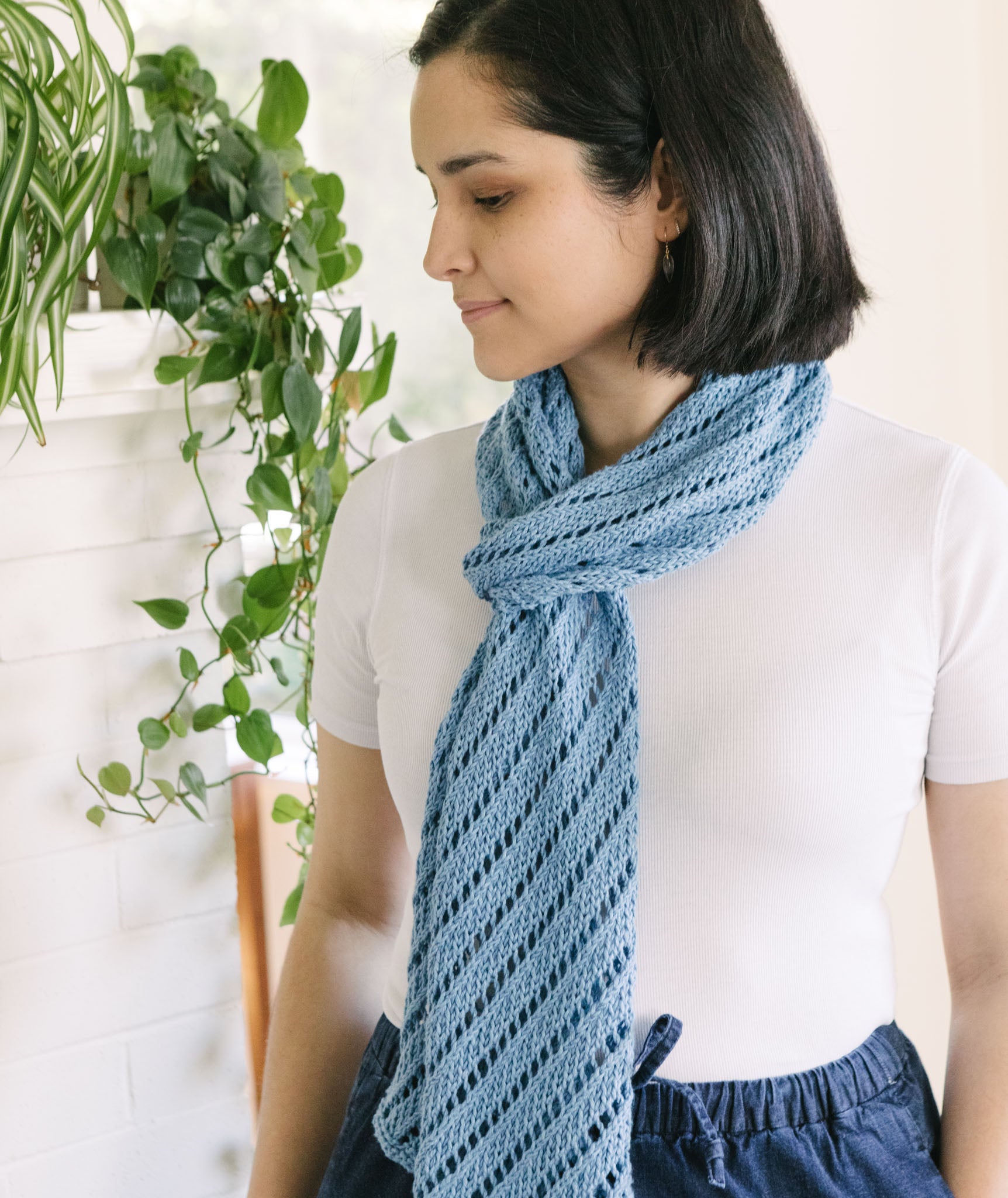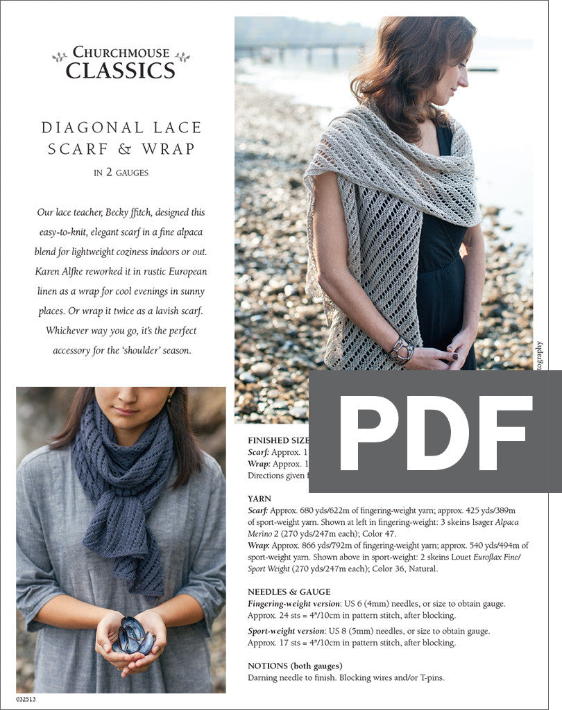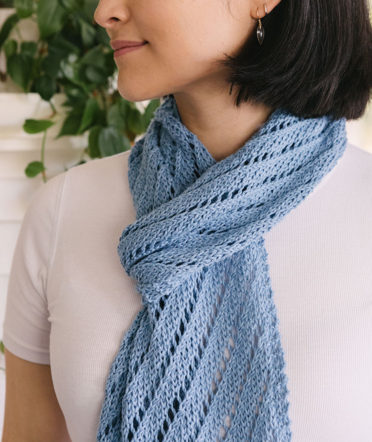 The Diagonal Lace Scarf is perfect for lightweight coziness indoors or out. And it’s an easy and satisfying lace pattern to knit–the repeating diagonal lines of eyelet provide easy visual clues, so you can quickly learn to “read” your lace and stop counting and looking at the chart.