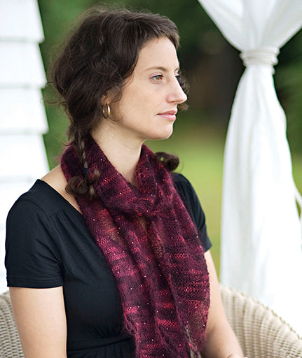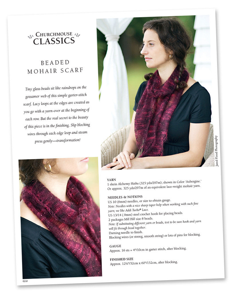 Tiny glass beads sit like raindrops on the gossamer web of this simple garter-stitch scarf. Lacy loops at the edges are created as you go with a yarn-over at the beginning of each row. But the real secret to the beauty of this piece is in the finishing. Slip blocking wires through each edge loop and steam press gently—transformation!