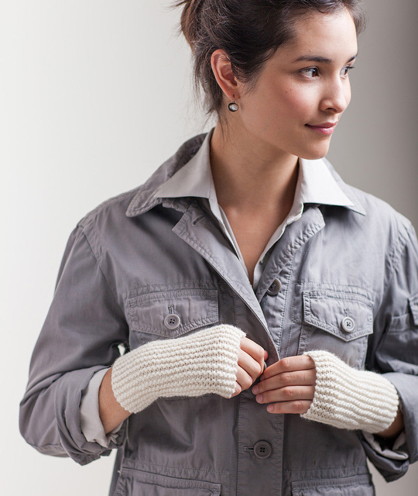 This Churchmouse Classroom First Projects pattern is about as simple as it gets—just knit, knit, knit. When you turn garter stitch on its side, the little ridges create a ribbed effect that is nice and stretchy, making the handwarmers easy to fit, with just a wee bit of seaming around the thumbs. Handsome on men and women alike, these easy pieces make great gifts. From you, the knitter!