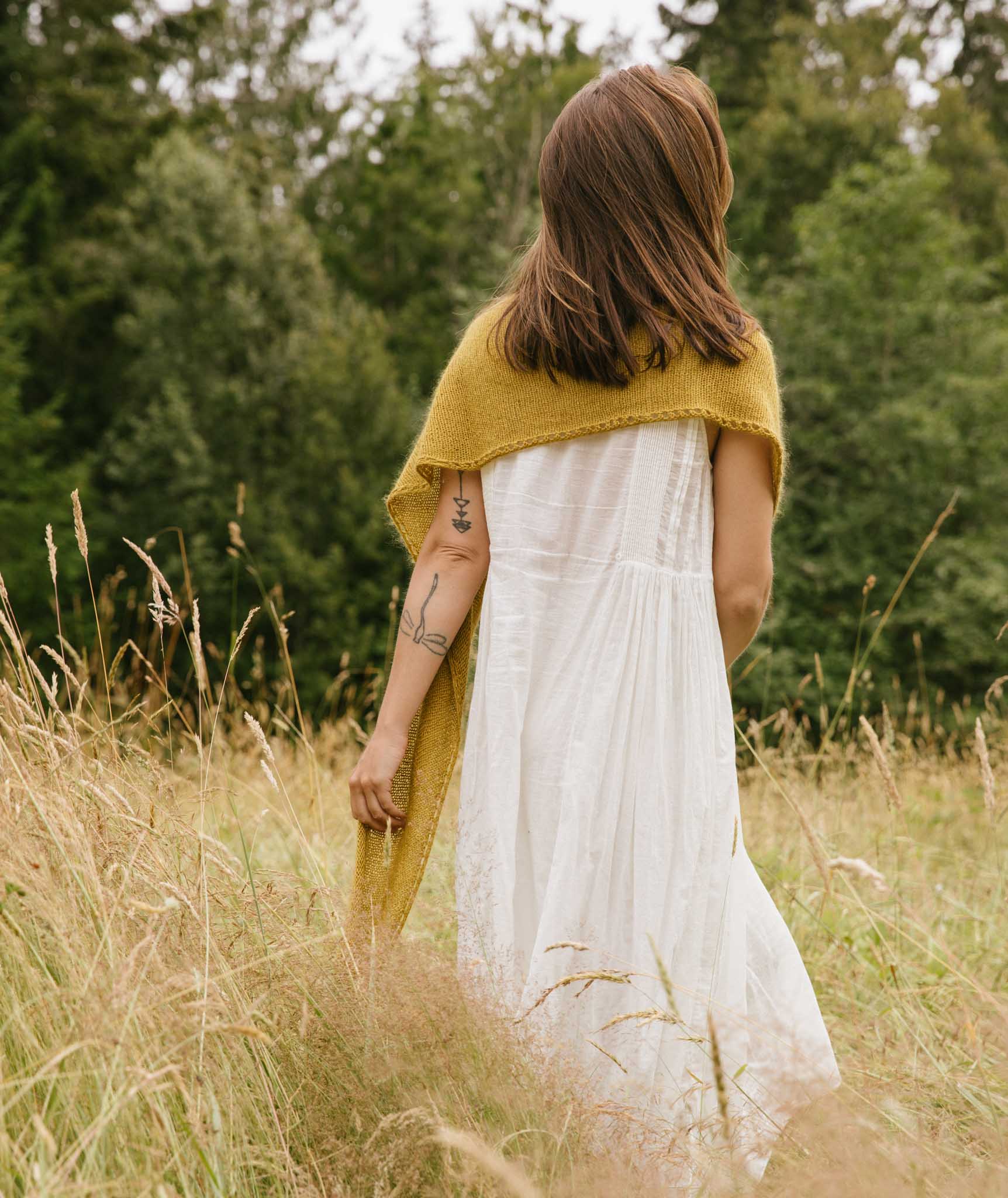 The relaxing rhythm of stockinette stitch creates a simple, supple fabric—the perfect canvas to play with degrees of sheerness. Adding a feminine eyelet lace edge keeps the knitting interesting. With long tapered ends, this scarf’s shape lies somewhere between half moon and triangle. Started at the top edge, the knitting gets faster and faster as you go!