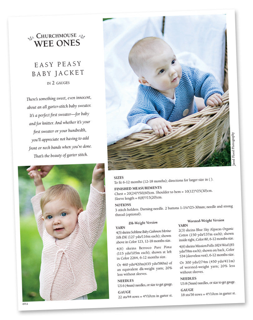 There’s something sweet, even naïve, about an all-garter-stitch baby sweater. It’s a perfect first sweater—for baby and for knitter. And, whether it’s your first sweater or your hundredth, you’ll appreciate not having to add front or neck bands when you’re done. That’s the beauty of garter stitch.