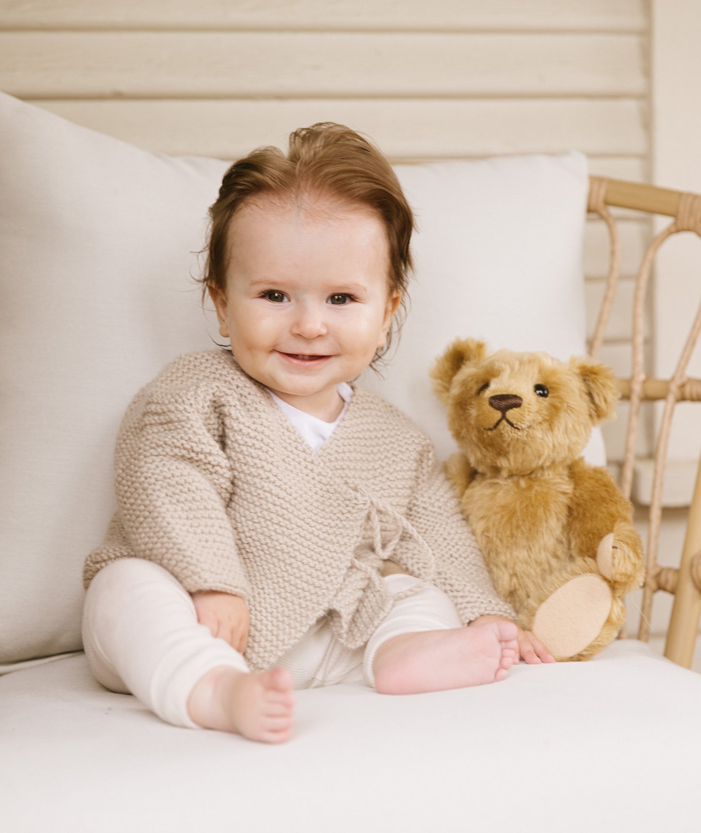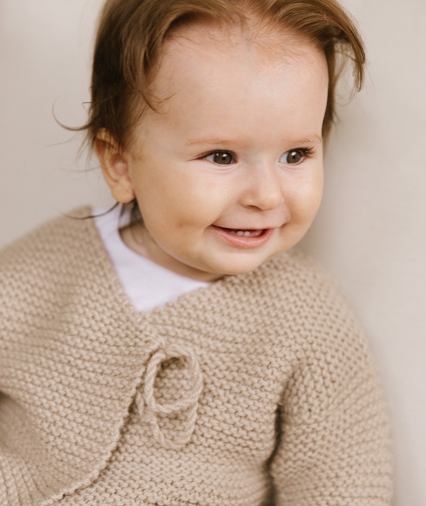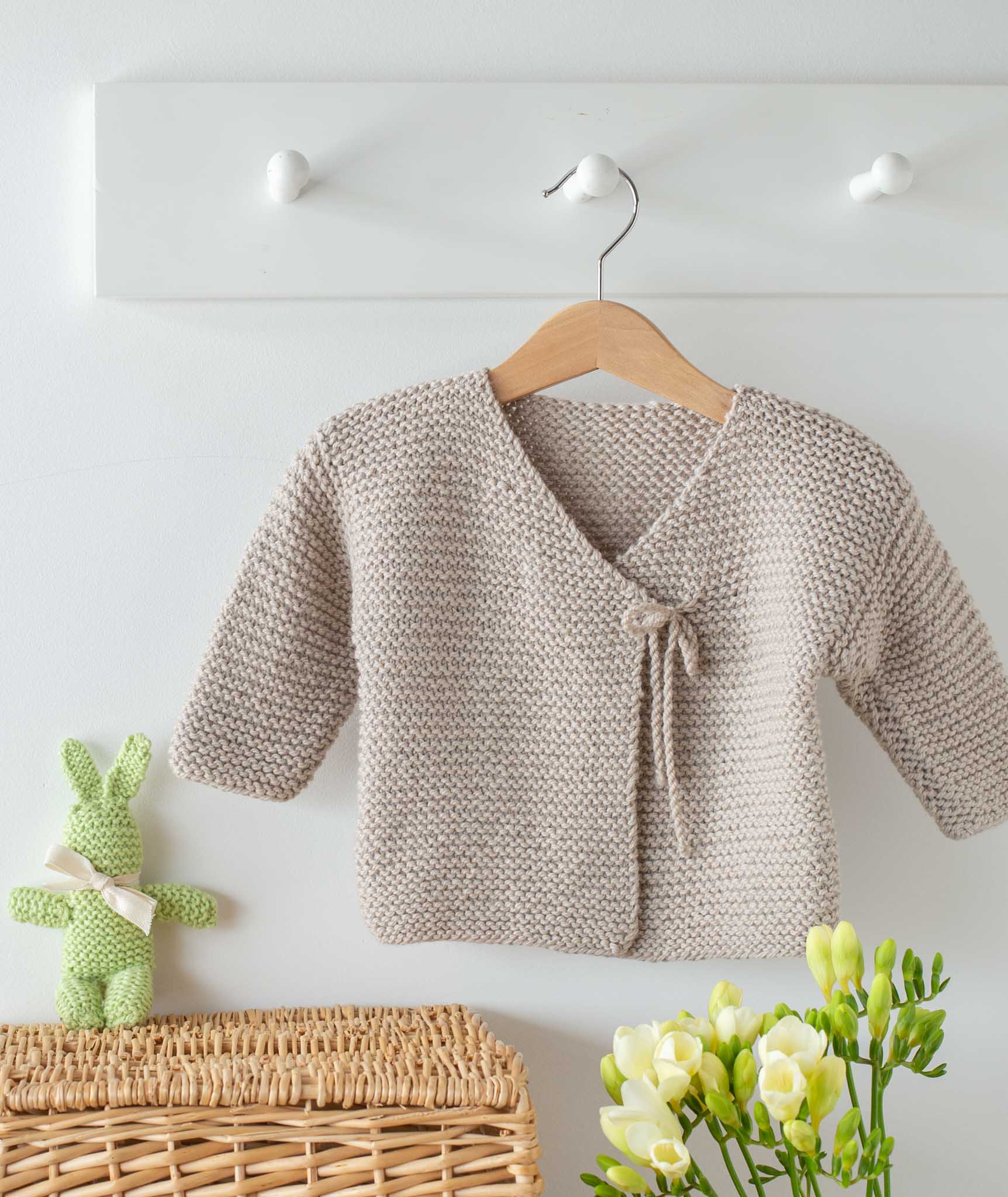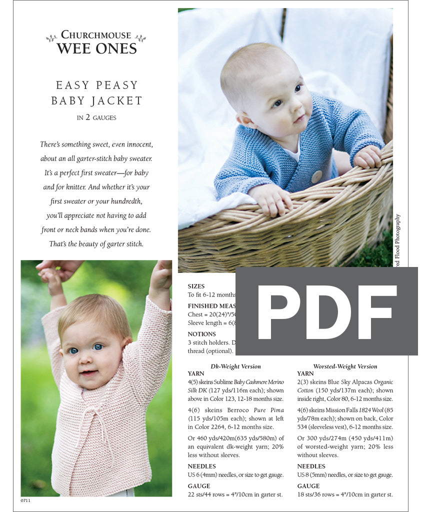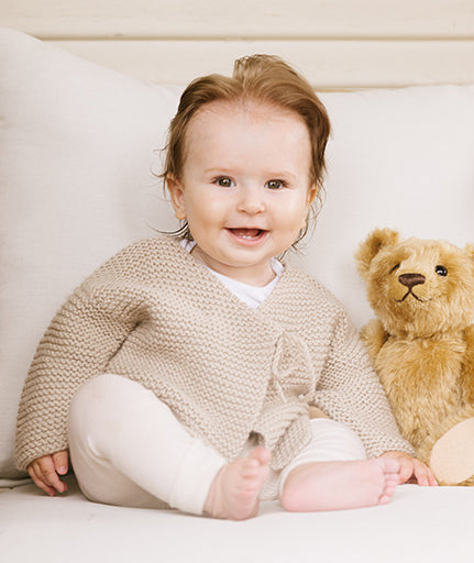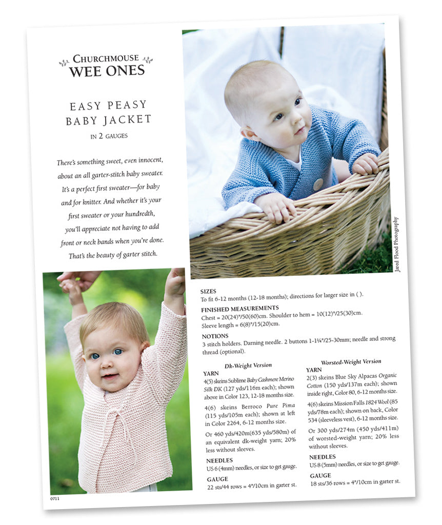 There’s something sweet, even naïve, about an all-garter-stitch baby sweater. It’s a perfect first sweater—for baby and for knitter! And, whether it’s your first sweater or your hundredth, you’ll appreciate not having to add front or neck bands when you’re done. That’s the beauty of garter stitch!