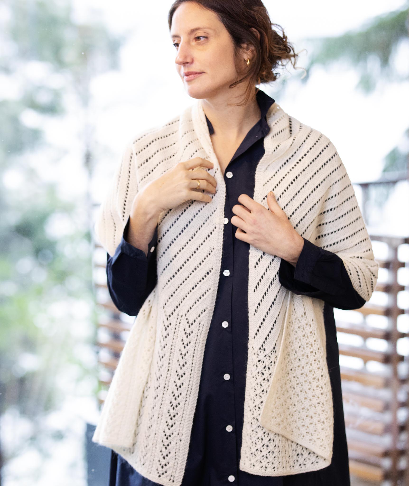 Three lace patterns in one generous scarf. The alpaca offers softness, drape, and a bit of haze, while the wool offers substance, strength, and gives memory to your stitches