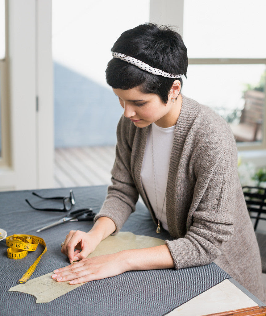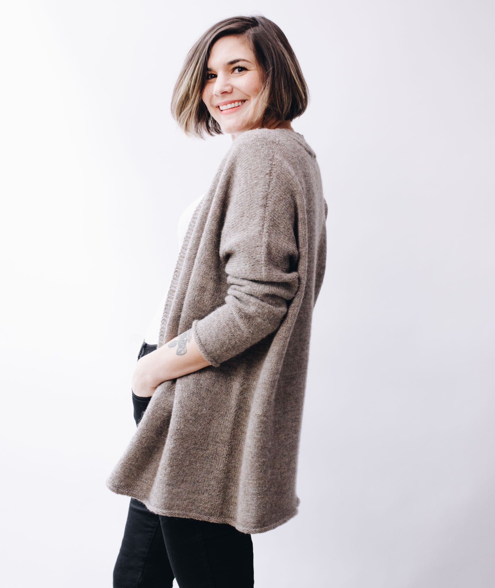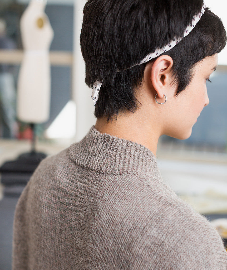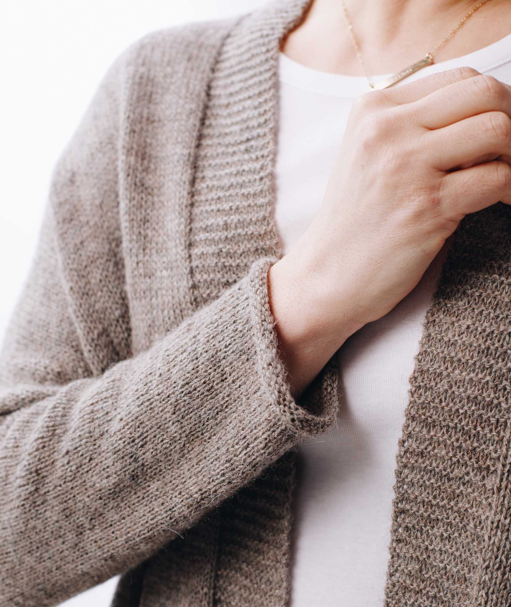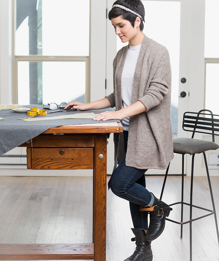 We developed a finer-gauge version of our original Modern Wrapper using two strands of lace-weight yarn held together. This sweet spot of gauge and needle size makes a super-wearable fabric.
