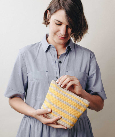 We crocheted this little pouch in two colors of Rowan Handknit Cotton, a 100% cotton, worsted-weight yarn. With tight plies and a smooth, cool touch, this workhorse of a yarn is fun to work with and easy to care for (machine washable!)—perfect for these frequently used pouches!