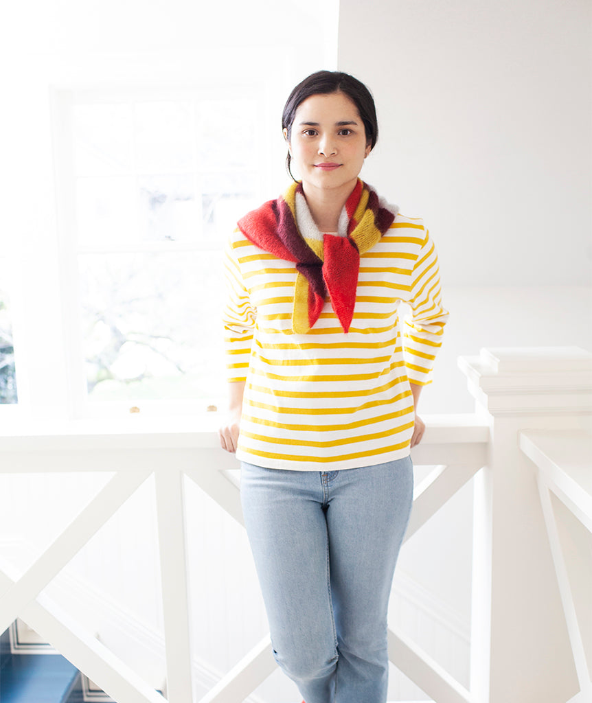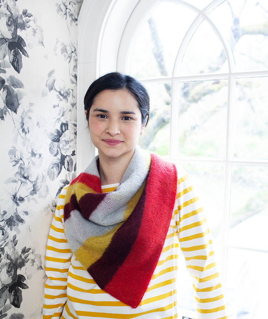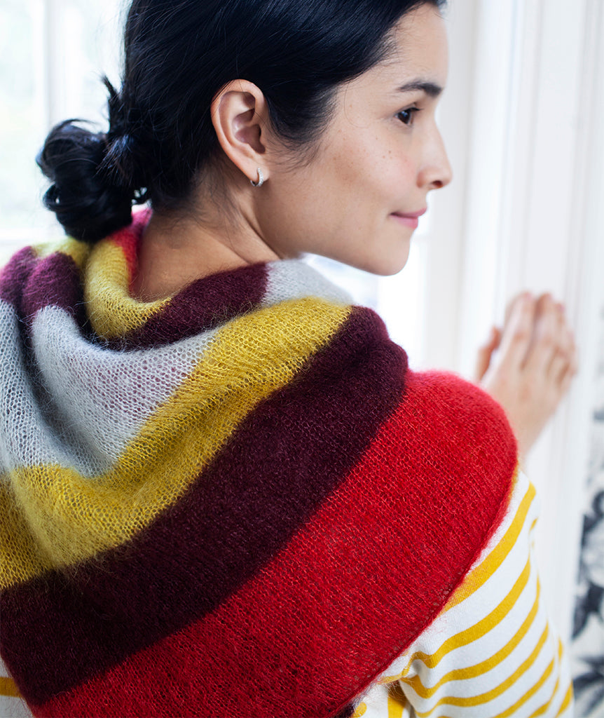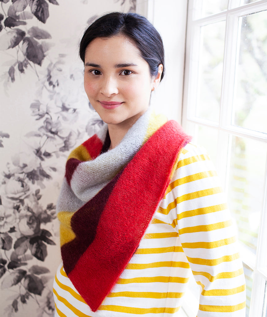 We knit this version of the Pretty Perfect Square in silky, fuzzy favorite, Rowan Kidsilk Haze—with four colors in fun, funky, uneven stripes. Delicate and fine, with a lovely halo, Kidsilk Haze creates scarves that are slightly sheer, weightless, and warm.