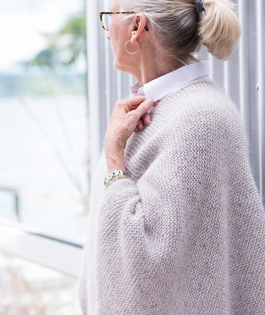 Do you remember ‘Janie’s Grandmother’s Quadrangle Wrap’, a shop favorite from years past? Inspired by the easy wearability of the original, we’ve re-visioned the wrap at a finer gauge, changed the direction of the knitting, dropped the back neckline to sit nicely on the shoulders, and finessed the front edges with small I-cord. Equally stylish with denim or a dress, on a beach walk or out to dinner, wear it a little differently every day!