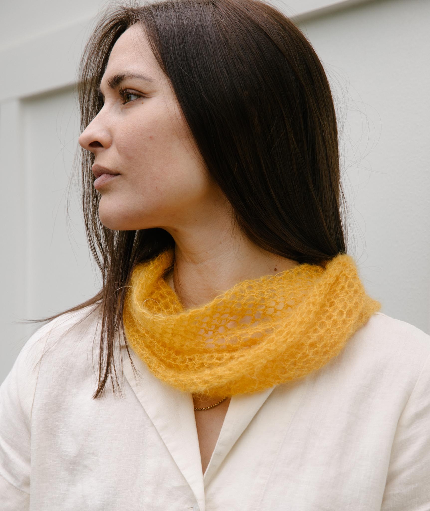 The Crocheted Moebius Cowl is as light as a whisper knit in Rowan Kidsilk Haze—a go-to favorite. It’s delicate and fine with a lovely halo and subtle fuzz. Strong but sheer, weightless but warm—perfect for this pretty loop!