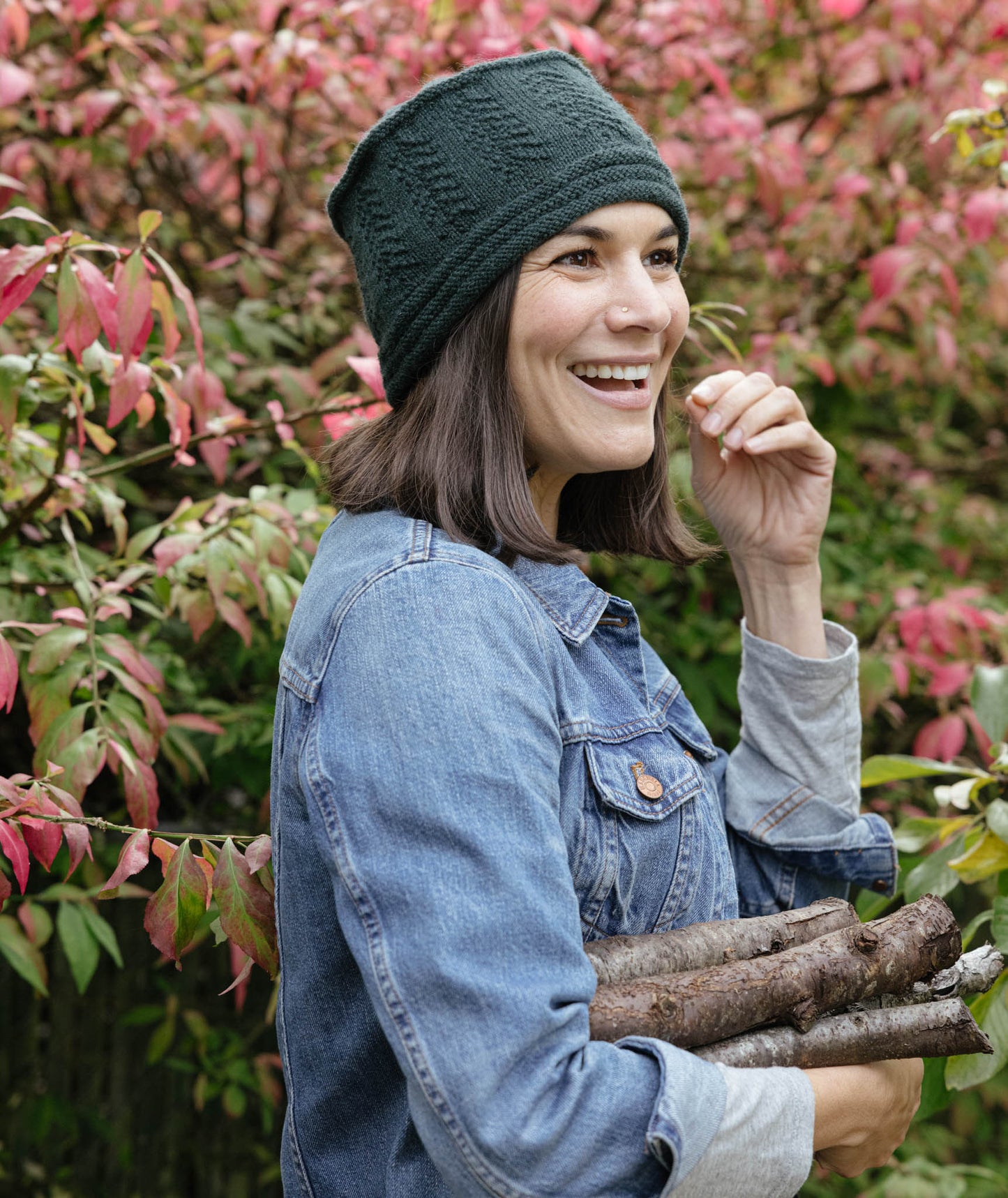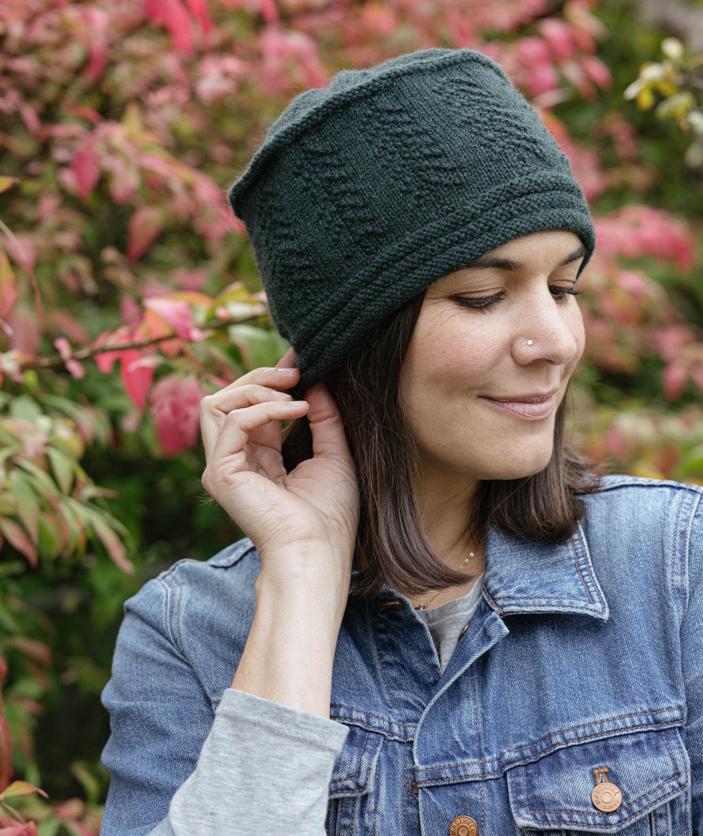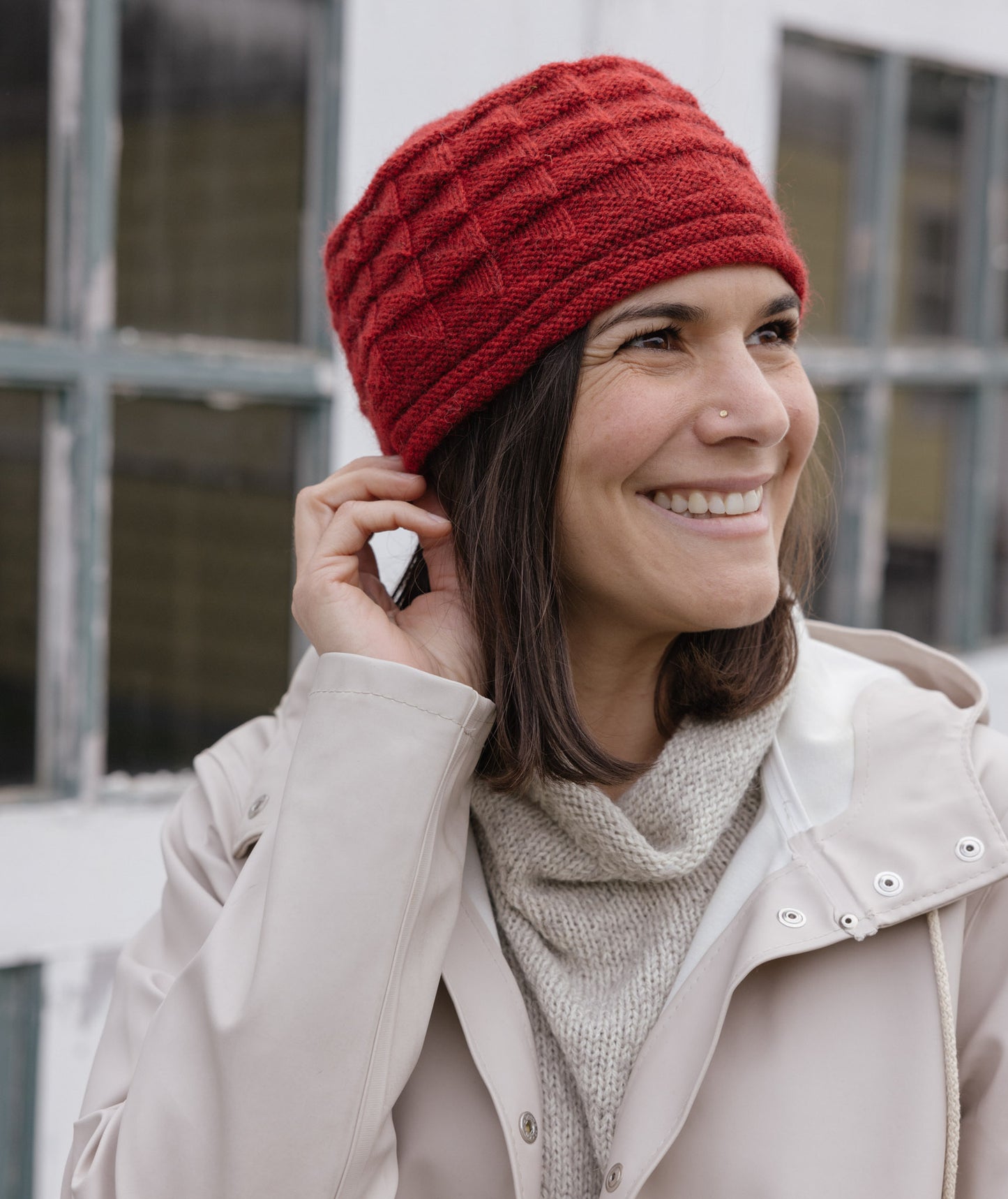 We love the tradition and history of ganseys—warm, durable, supple garments originally developed to protect seafarers from the cold and sea spray! This cute pillbox hat, with a flat circular top, pays tribute to that beloved sweater. We’ve provided two traditional gansey pattern charts—”Nautical Flags” and “Tree Line”, but you can also create your own!
