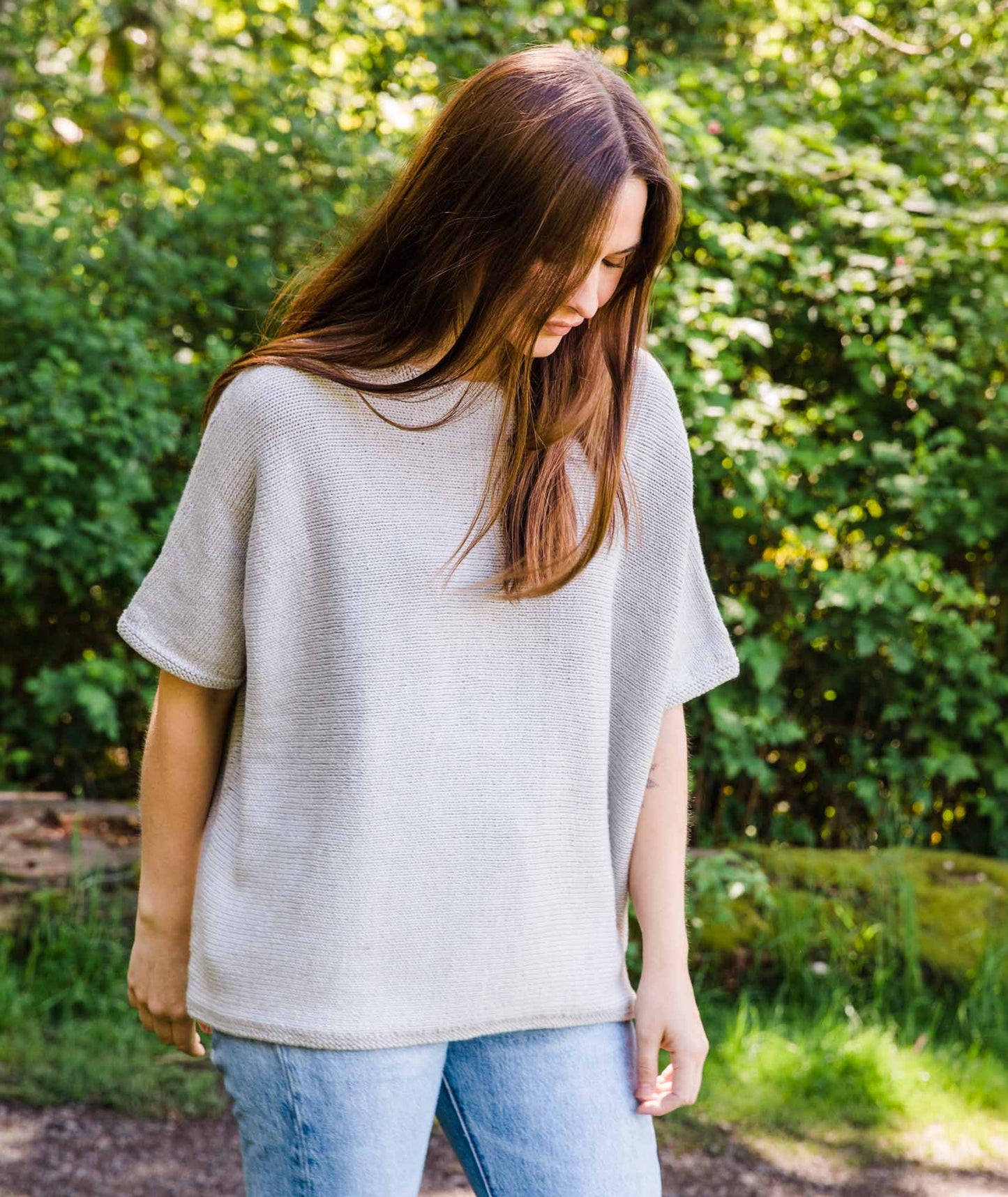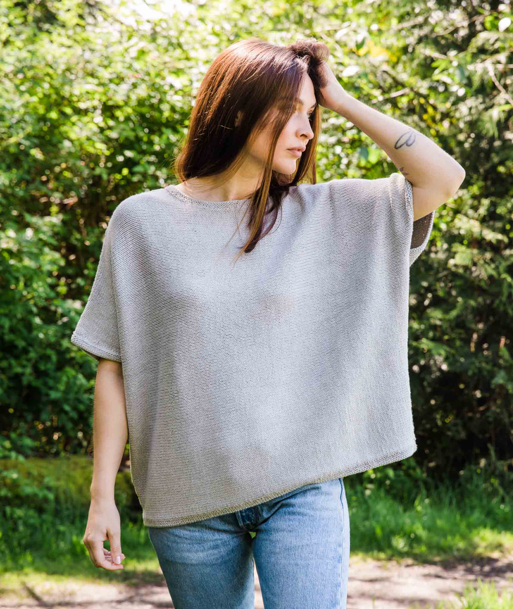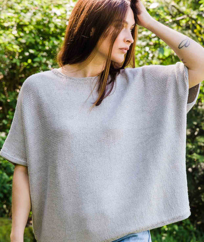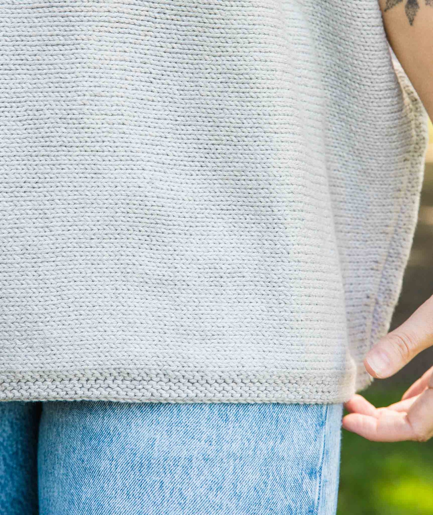 This deceptively simple top is cleverly knit from the center out to each side, rather than from top to bottom or vice versa. A modern pivot to a familiar style! A tapered shape allows for plenty of ease at the bust , while providing a relaxed and flattering bottom edge at hip length.