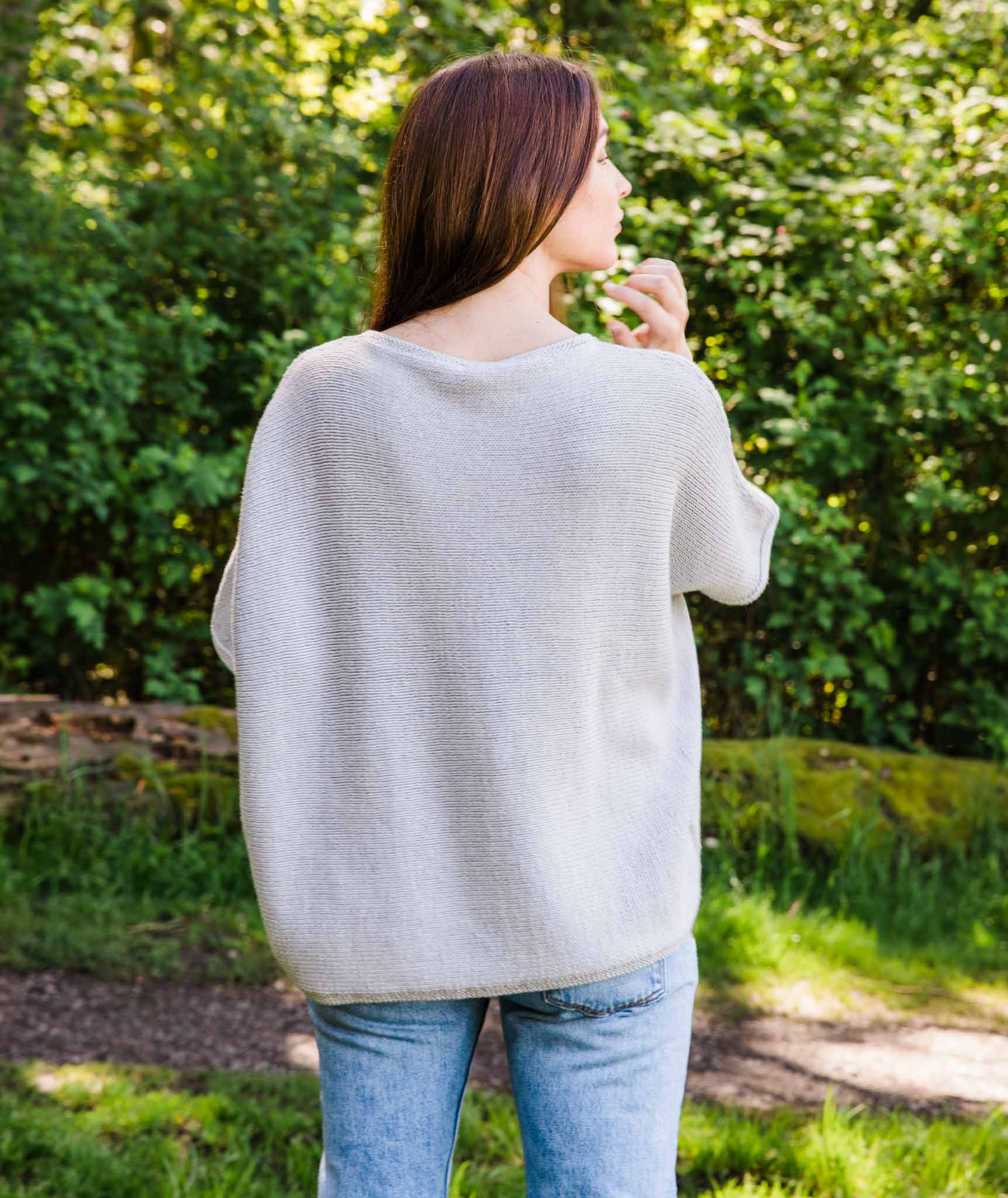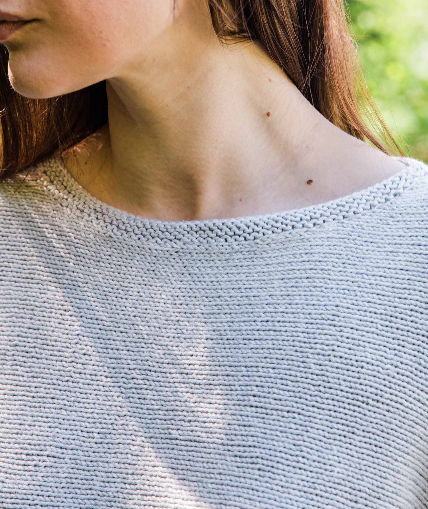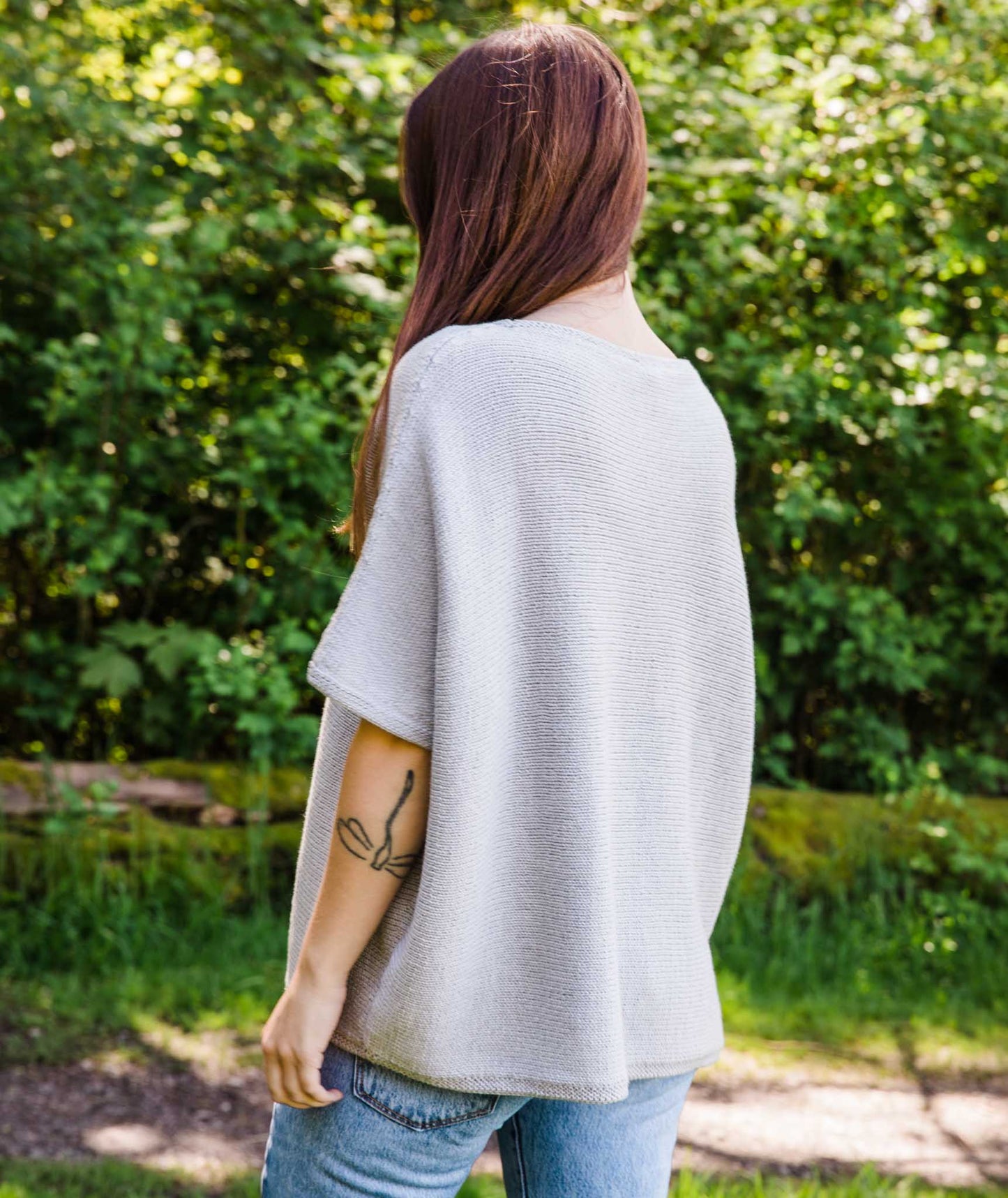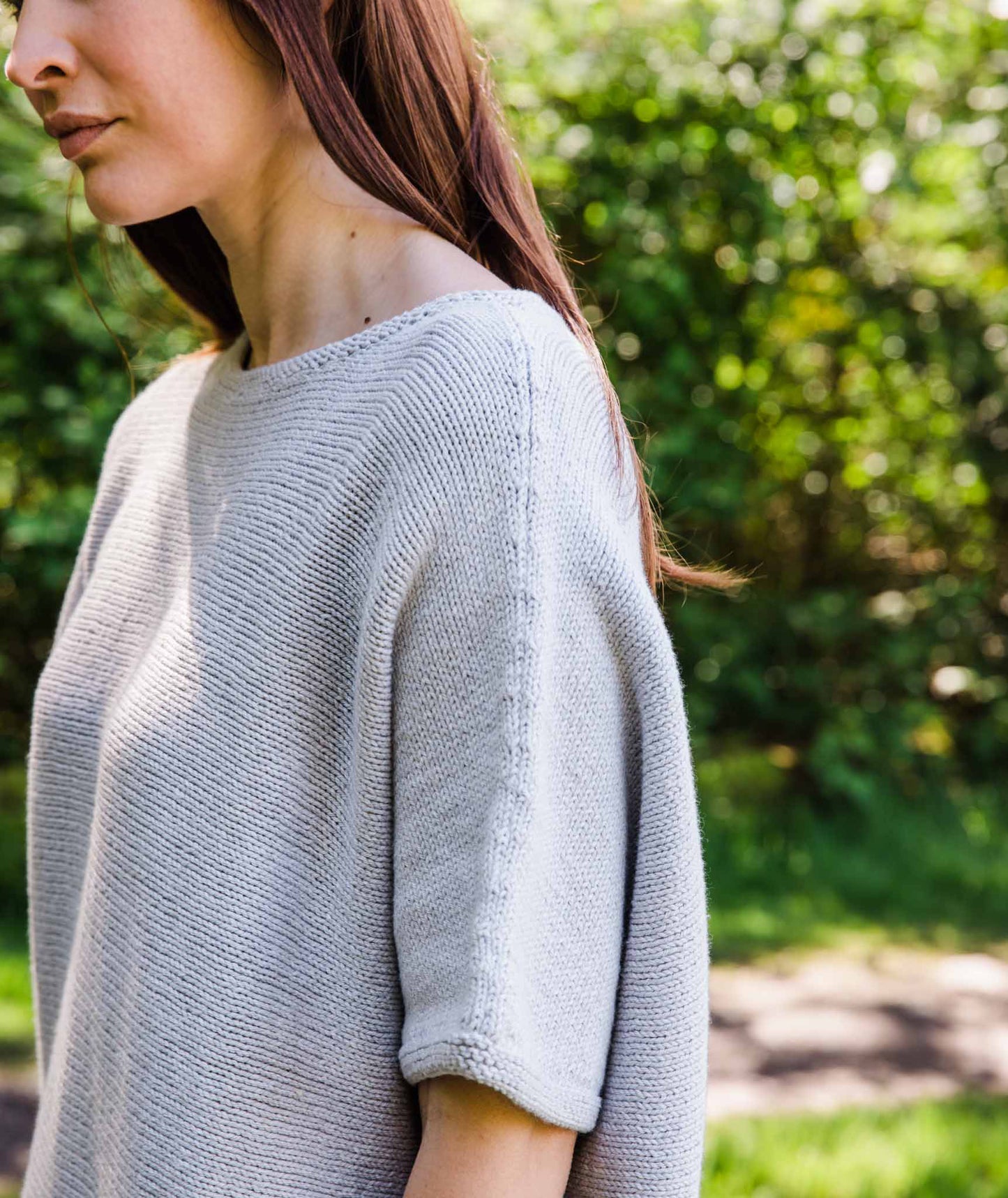 This deceptively simple top is cleverly knit from the center out to each side, rather than from top to bottom or vice versa. A modern pivot to a familiar style! A tapered shape allows for plenty of ease at the bust , while providing a relaxed and flattering bottom edge at hip length.
