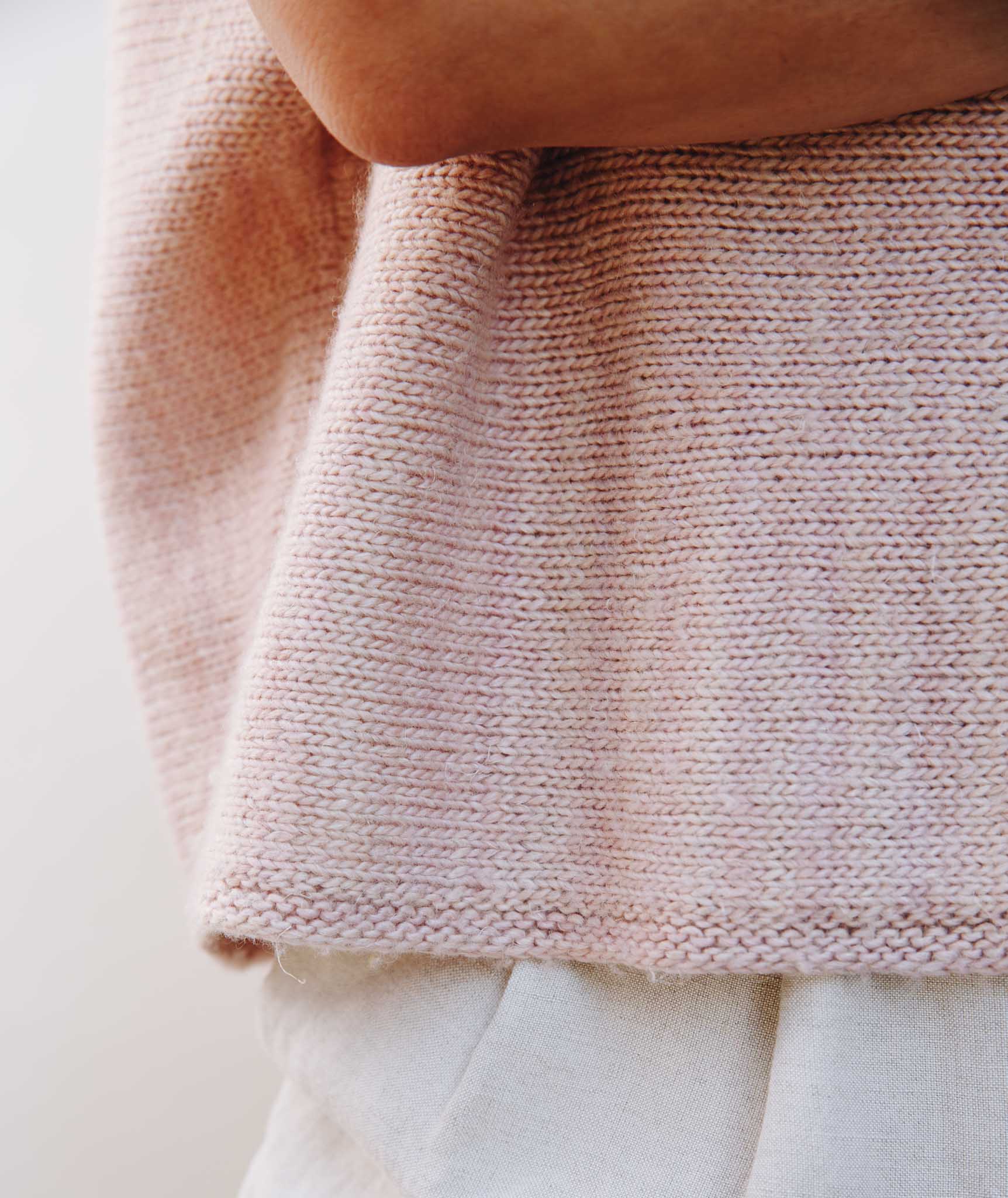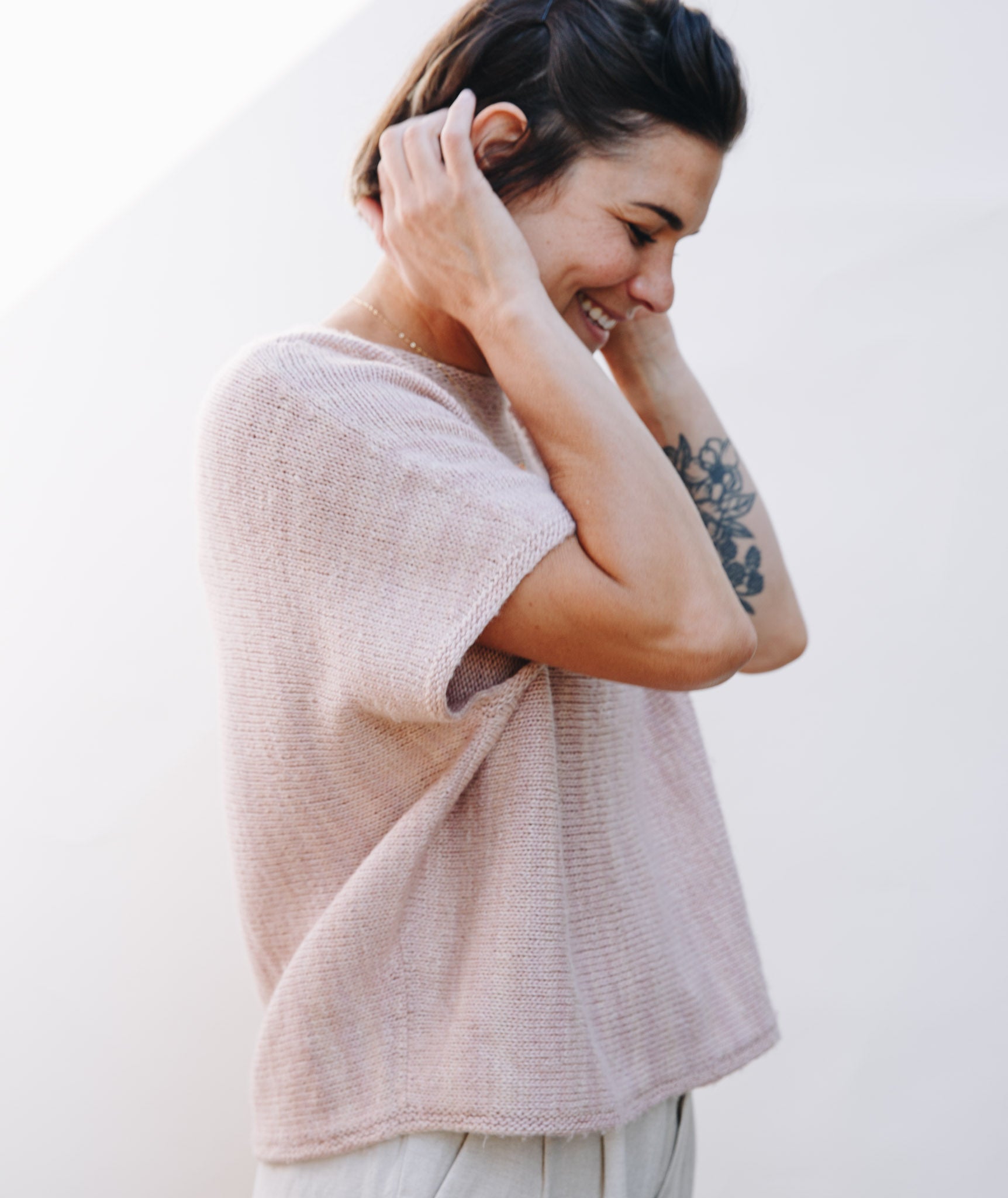 We knit this transitional tee in lofty Manos del Uruguay Milo. At first glance, this sport-weight yarn has a homey, rustic charm. Then, you start to see the natural complexity of this blend of merino wool and linen. Linen retains a bit more of its natural color through Manos’ hand-dying process, leading to beautifully heathered shades with a subtle sheen.