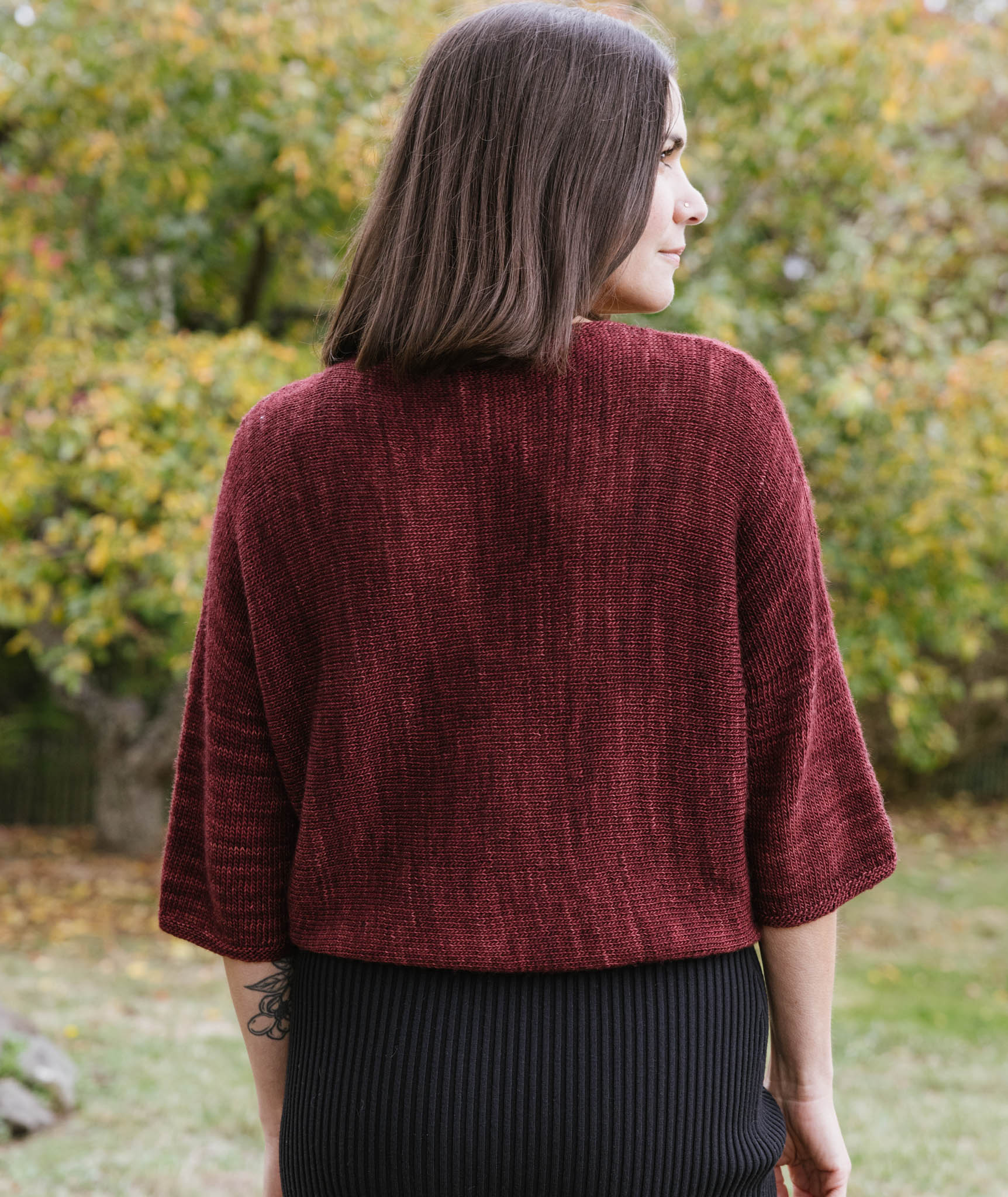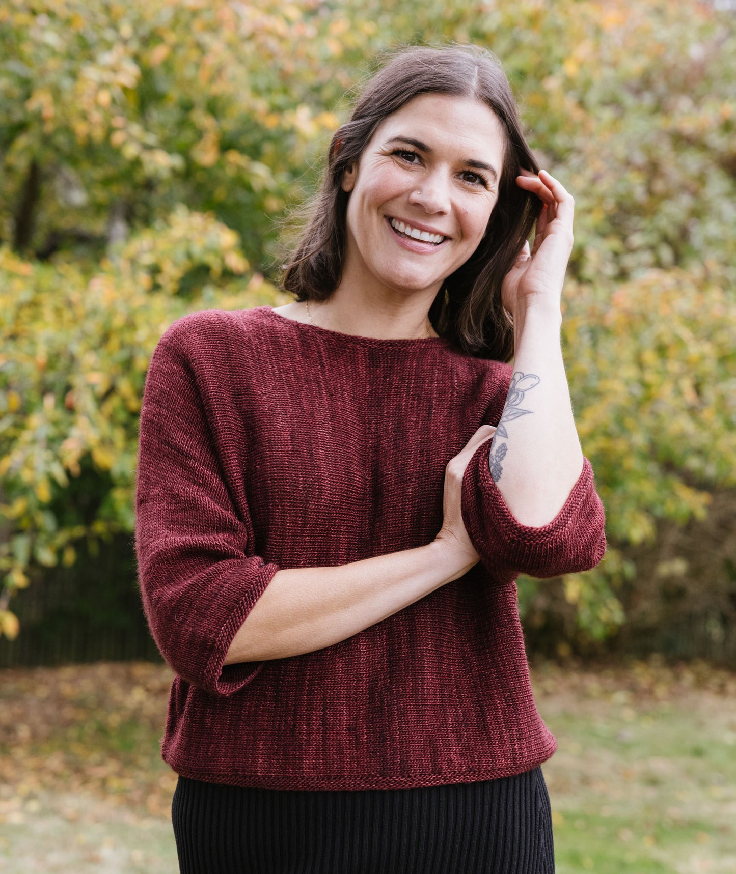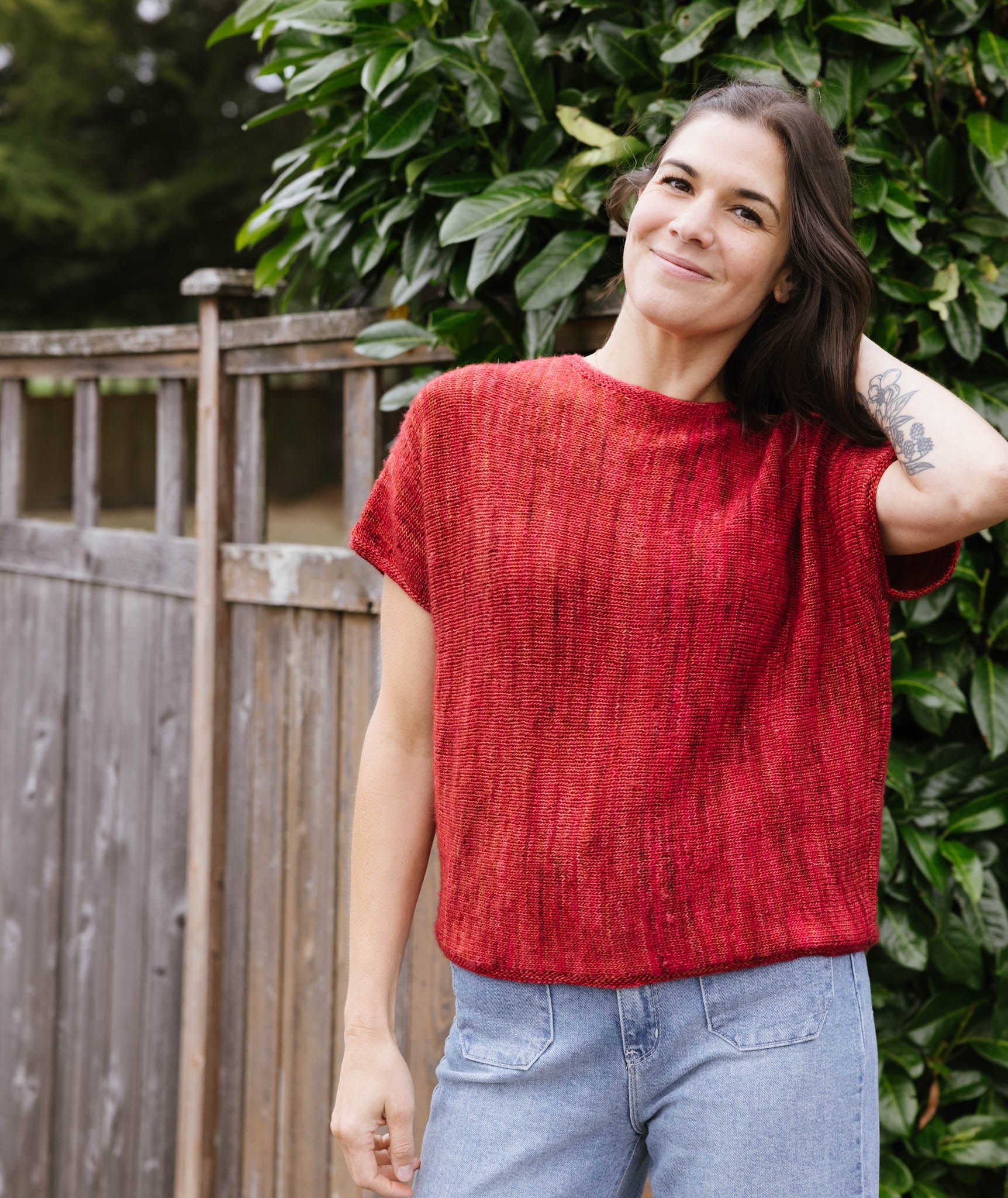 This deceptively simple top is cleverly knit from the center out to each side, rather than from top to bottom or vice versa. A modern pivot to a familiar style! A tapered shape allows for plenty of ease at the bust, while providing a relaxed and flattering bottom edge at hip length. We’ve also created a free adaptation to our original pattern so that you can add three-quarter-length sleeves to your tee! With no shaping to the sleeve, it’s a simple addition that makes a sweet, stylish difference.