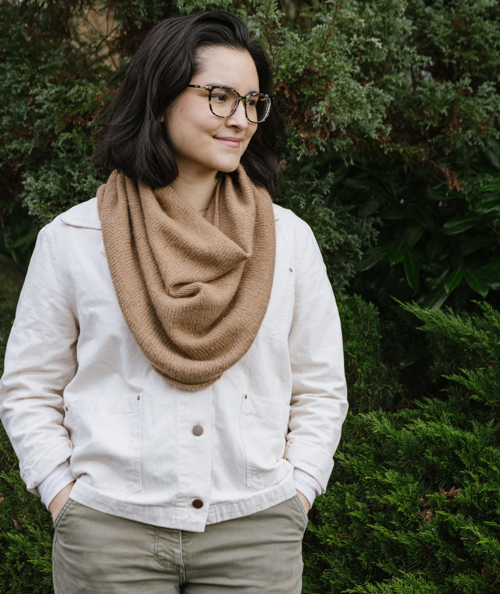 The long, slow shaping of this cowl begins with a wider base that slips as far over one or both of your shoulders as the circumference allows, while the narrower top end fills in the neck to keep you beautifully cozy.
