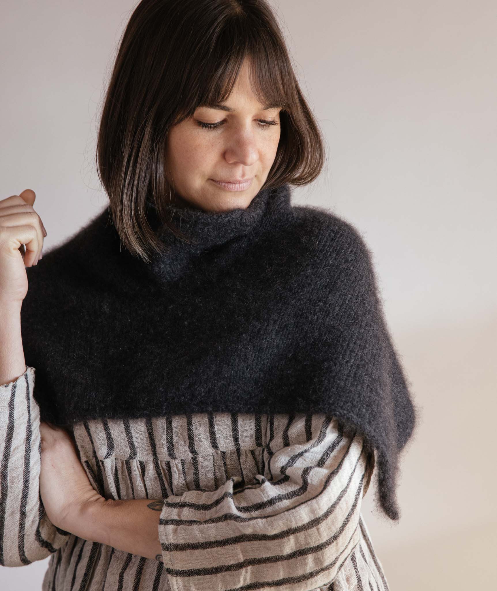 Inspired by our ever-popular Easy Folded Poncho, this scaled-down version is totally seamless and slips easily over the shoulders. The simple shape makes it easy to re-yarn in another gauge. Just swatch for a softly draping fabric, then multiply the schematic dimensions by your stitch gauge—the math is easy!